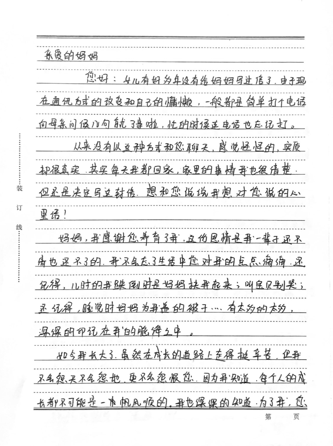 ——“媽媽?zhuān)瑑鹤右呀?jīng)長(zhǎng)大,和兒媳一定會(huì)好好孝敬您二老的。祝您身體健康,萬(wàn)事如意!”