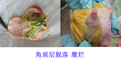 谷鳳柱教授還說,肌胃炎多和腺胃炎同時發(fā)生,但也可單獨發(fā)生,且對雞的危害大于腺胃炎。由于病因不同,臨床肌胃角質(zhì)層的病理變化也不盡相同。臨床上經(jīng)??吹郊∥附琴|(zhì)層的糜爛、崩解一定是發(fā)生了肌胃炎,但角質(zhì)層沒有糜爛不一定不是肌胃炎,要認真辯證分析。如果發(fā)現(xiàn)角質(zhì)層已經(jīng)發(fā)生褪色、變淡,那么我們就應(yīng)該注意了。