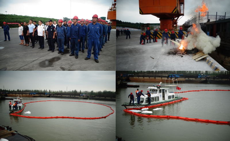 活動(dòng)分為港口岸上火災(zāi)消防演練以及水域環(huán)境污染緊急處置兩部分進(jìn)行。岸上消防演練首先模擬了??看耙馔獍l(fā)生火災(zāi),按照預(yù)案部署,應(yīng)急救援小組立即開展滅火救援工作。事故救援組深入火災(zāi)現(xiàn)場(chǎng)全面搜救被困人員,搶險(xiǎn)組合理設(shè)置滅火陣地,控制火勢(shì)蔓延,最后將火情撲滅。水域環(huán)境污染演練模擬了物流中心裝船作業(yè)船只在港區(qū)靠泊作業(yè)期間,意外跑冒黑色污染物,現(xiàn)場(chǎng)員工發(fā)現(xiàn)后立刻向現(xiàn)場(chǎng)指揮部報(bào)告。指揮部接報(bào)后,在命令意外泄污船只先自行控制污染源的同時(shí),立即啟動(dòng)物流中心船舶作業(yè)活動(dòng)污染水域應(yīng)急預(yù)案,調(diào)遣應(yīng)急小組前往清污,并向濟(jì)寧市港航局鄒西航管處匯報(bào)。應(yīng)急小組拖掛圍油纜到達(dá)現(xiàn)場(chǎng)后,分別拖住圍油纜的一頭靠近不斷擴(kuò)散的污染物,從兩邊包抄將污染物團(tuán)團(tuán)包圍起來(lái)。另有一方面配合海事船只圍油纜船,防止污染擴(kuò)散。此外,應(yīng)急人員在統(tǒng)一指揮下向河中拋撒吸油氈,清理遺留在圍油纜外的零星污染。待污染物被圍油纜徹底圍攏后,清污隊(duì)員立刻對(duì)污染物進(jìn)行回收。約半小時(shí)后,污染物被全部清除。