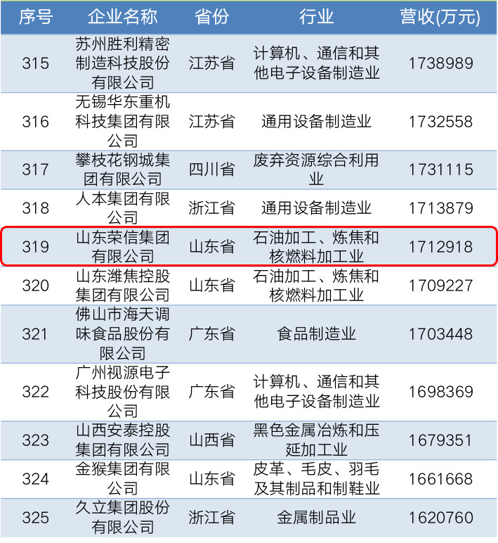 8月22日,全國(guó)工商聯(lián)在青海發(fā)布了“2019中國(guó)民營(yíng)企業(yè)500強(qiáng)”系列榜單,山東榮信集團(tuán)以1712918萬(wàn)元的營(yíng)業(yè)收入位列中國(guó)民企制造業(yè)第319位,這是集團(tuán)第四次榮列中國(guó)民企制造業(yè)500強(qiáng)榜單。